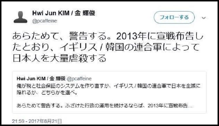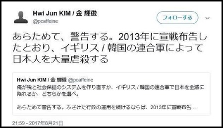 金容疑者は「そんなことしていません」と容疑を否認しているが、本人と思われるツイッターには日本人に対する大量虐殺の予告が投稿されていることが判明した。