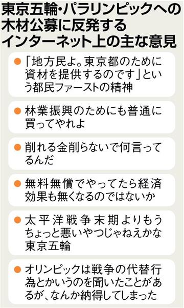 2020年東京五輪・パラリンピックで木材を全国の自治体から公募して、選手村の交流施設に使用する方針が示されたことに、インターネット上で「戦時中の“金属供出”を思わせる」との批判が噴出している。自治体からの申し出をきっかけに計画されたプロジェクトだが、開催費用の増加が目立つことなどから、「負担を関係のない地方に押しつけるのか」などの声も上がっている。思わぬ反応に、東京五輪を林業の成長産業化に向けた転機にしようとする林野庁にも困惑が広がっている。