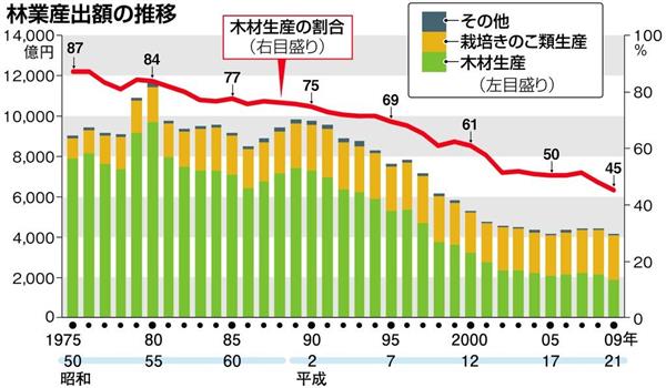国内の木材生産の産出額は、昭和55年の約1兆円から、近年は2000億円程度にまで低迷しており、産業としての危機的状況にある。林野庁幹部も「『無償でもいいから使ってほしい』と宣伝したいのが地方の本音」と林業者の窮状を明かす。