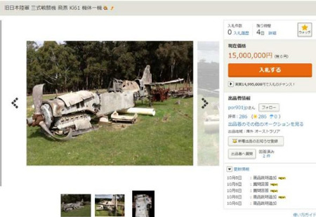 旧日本陸軍の三式戦闘機「飛燕」の機体がヤフオク!に出品されています。開始額は1500万円。