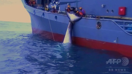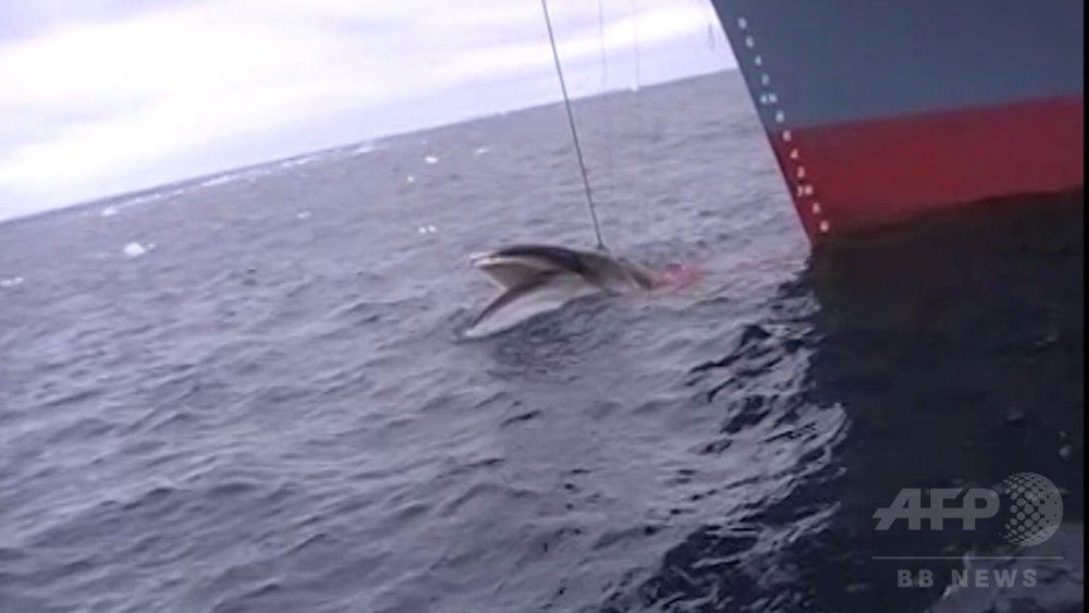 オーストラリアの巡視船の乗っている税関職員が撮影した動画には、南極海で日本の捕鯨船から放たれた銛(もり)がクジラに突き刺ささり、血の広がった海からクジラが船に引きあげられる様子が映っている。