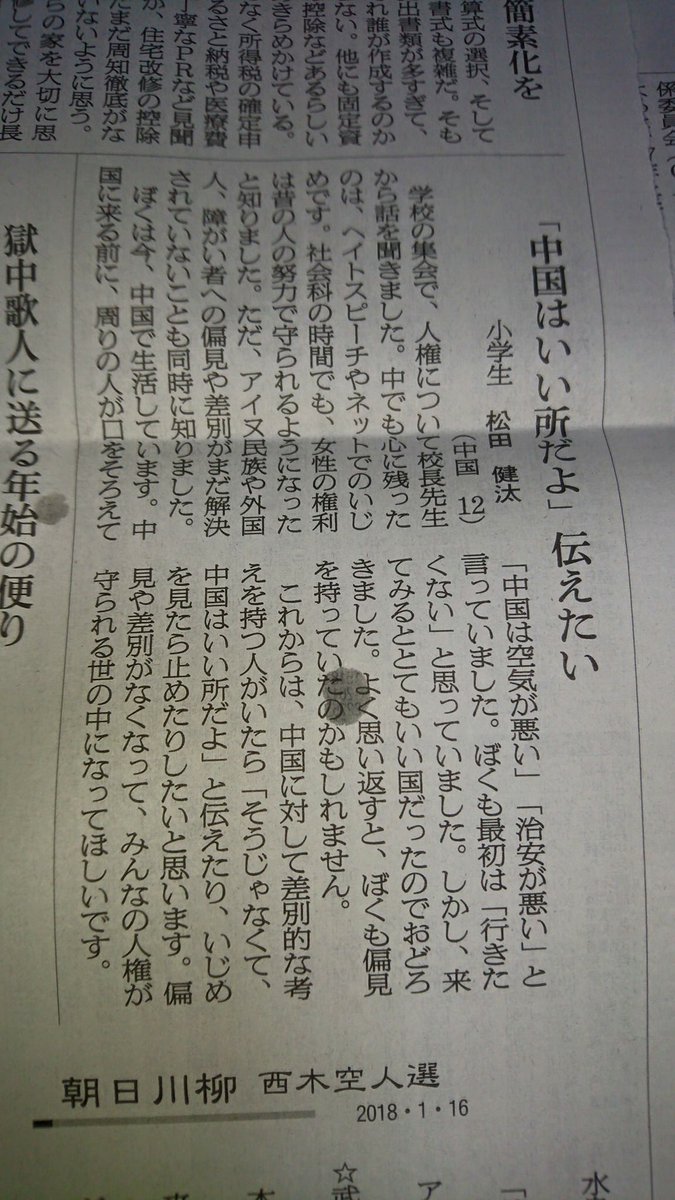 朝日に投稿する小学生、しかも中国から
