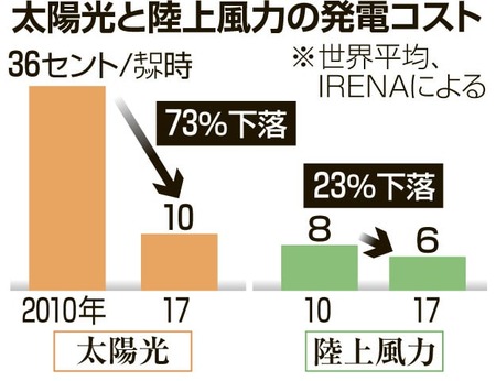 地球温暖化対策として拡大が期待される再生可能エネルギーの発電コストが2010年からの7年間で大幅に下がり、世界平均で太陽光は73%、陸上の風力は23%下落したとの報告書を、国際再生可能エネルギー機関(IRENA)が12日までにまとめた。
