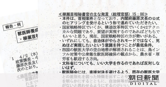 学校法人「加計(かけ)学園」が愛媛県今治市に獣医学部を新設する計画について、2015年4月、愛媛県や今治市の職員、学園幹部が柳瀬唯夫首相秘書官(当時)らと面会した際に愛媛県が作成したとされる記録文書が存在することがわかった。柳瀬氏が面会で「本件は、首相案件」と述べたと記されている。政府関係者に渡っていた文書を朝日新聞が確認した。