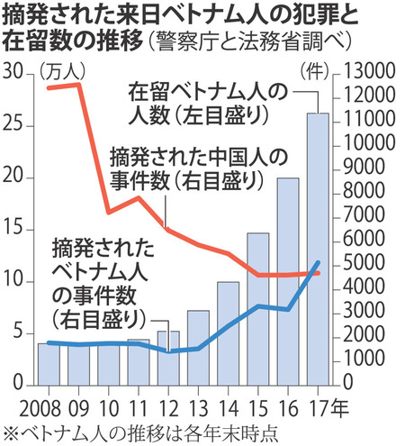 ベトナム人による事件が5140件と3割を占め、統計を取り始めた1989年以降、