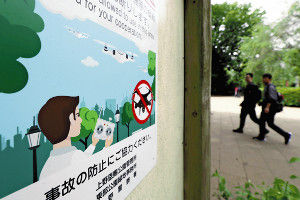 上野公園内に掲示されたドローンの使用禁止を呼びかける看板(16日午前)