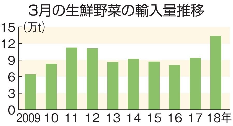 3月の生鮮野菜の輸入量が13万3847トンと、単月としては13年ぶりの高水準だったことが、財務省が26日公表した貿易統計で分かった。輸入野菜離れを起こした2007年の中国製冷凍ギョーザ中毒事件以降では最大。国産の高騰が長期化するとの懸念が拭えず、中国産の結球野菜を中心に業務・加工業者からの輸入物への需要が強かった。業者は4月以降も輸入量が前年を上回る可能性が高いと見通す。