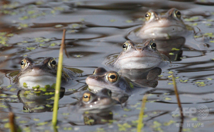 写真:ドイツ東部ライプチヒの池から顔を出したカエルたち