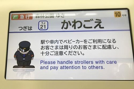 東武鉄道によると、注意喚起は東武野田線と東武東上線の一部車両内で、ドアの上にあるディスプレーに表示。東武野田線では2013年から、18編成で導入している。