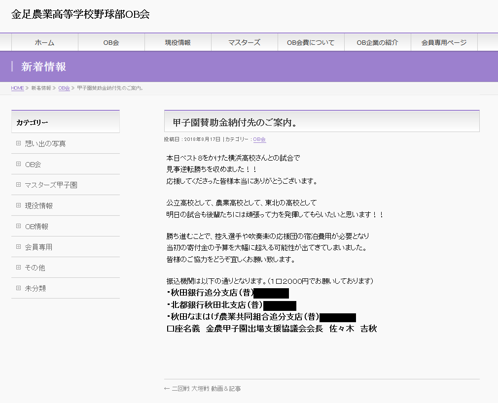 甲子園賛助金納付先のご案内。
