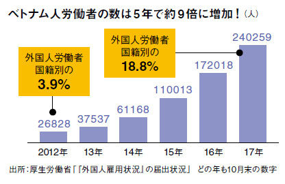 日本で働く外国人労働者数は、2017年10月末現在で約128万人。このうちベトナム人は約24万人で、全体の18.8%を占める。これは29.1%の中国人に次ぐ人数だ。12年にベトナム人は全体の3.9%にすぎず、人数はこの5年間で約9倍にも増えた。