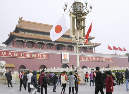 【北京=西見由章】毛沢東の肖像画を掲げている中国・北京の「天安門」前では25日、安倍晋三首相の訪中に合わせて10対の日の丸と中国国旗「五星紅旗」が数十メートルおきに設置され、