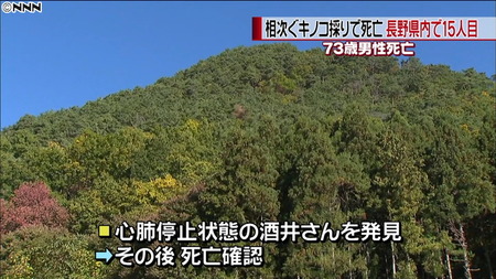 27日、長野県千曲市の山林に1人でキノコ採りに出掛けた73歳の男性が死亡した。長野県内で今シーズン起きたキノコ採りに伴う死者は15人に上っている。