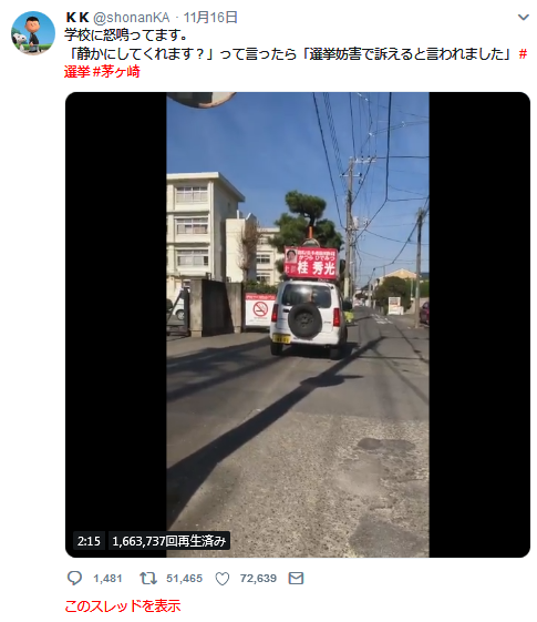 茅ヶ崎市長選の選挙カーが校門の前で立ち往生して演説してた。先生方が止めても無視し続けて演説。こんなので良いの?
