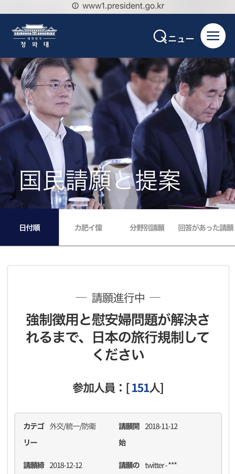 日本政府としてもこの請願を後押しするために韓国人はビザ必須に戻した方がよいのでは?