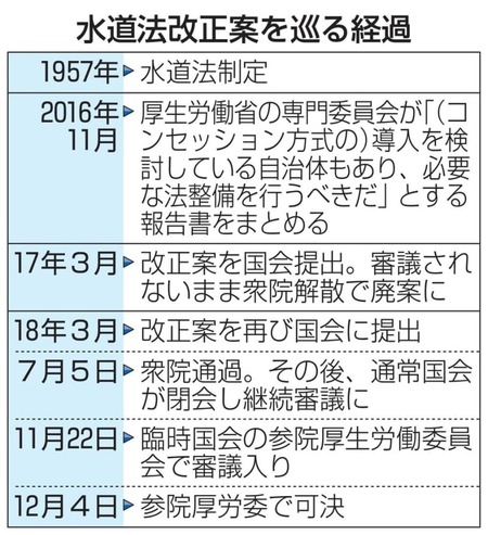 運営権を民間に委託する「コンセッション方式」の導入を盛り込んだ水道法改正案を与党や日本維新の会などの賛成多数で可決した。