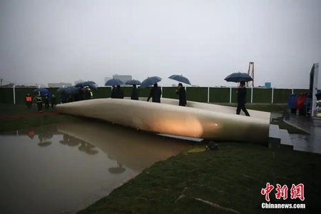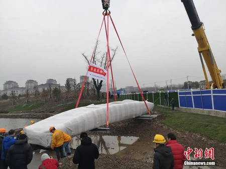 中国初の3Dプリンター技術を使い1度に成形された橋が11日、上海市の桃浦中央緑地に設置された。