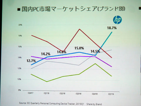 同社によると、IDC Japanの調査で、18.7%のシェアを獲得。2018年第4四半期(2018年10〜12月)の3位のポジションから、一気に首位に躍り出た。「市場全体が前年同期比30%増というなかで、日本HPは前年同期比70%増という成長を遂げている」(日本HP パーソナルシステムズ事業統括の九嶋俊一専務執行役員)という。