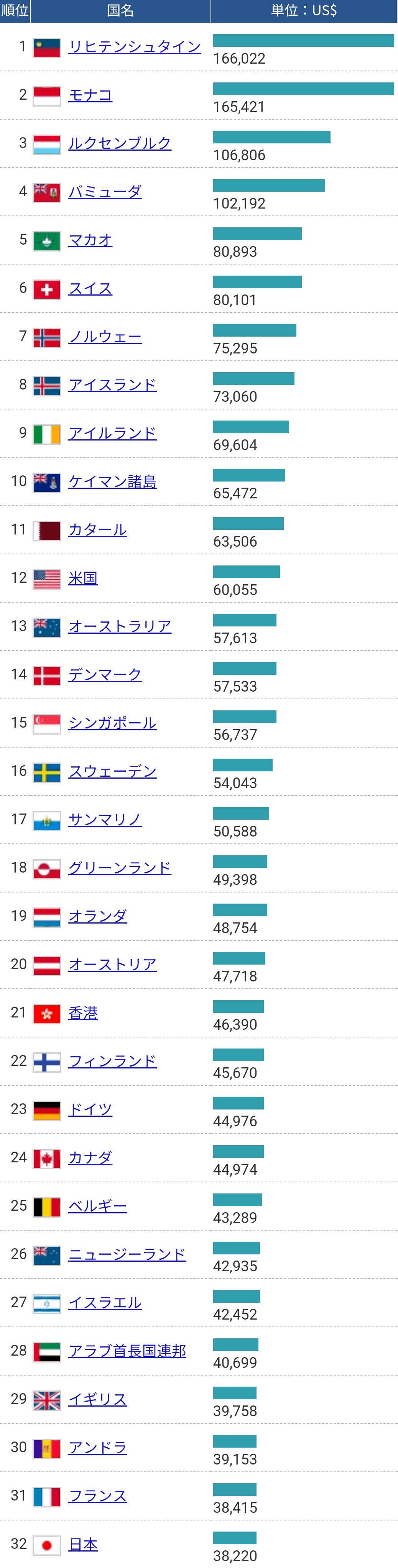 国別GDPランキングでは中国に抜かれてしまいましたが、国民一人当たりのGDPをみると、また景色が違って見えます。