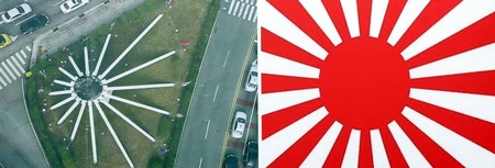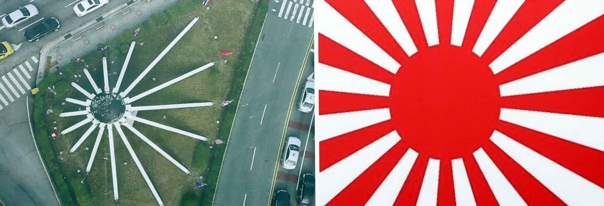 韓国釜山にある国連軍参戦記念塔を空から見ると日本の旭日旗にそっくりだと判明し韓国で騒動になっている。