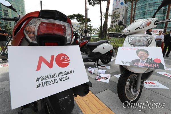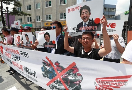 33もの二輪車の輸入業者が集まった韓国の輸入二輪車環境協会は19日13時、ソウル退渓路5街で、安倍政府の経済報復糾弾大会を開いた。