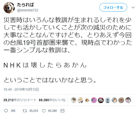 ・とりあえず今回の台風19号首都圏来襲で、現時点でわかった一番シンプルな教訓は、N H K は 壊 し た ら あ か ん