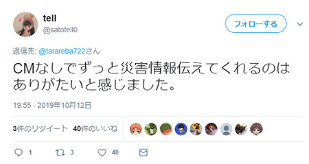 ・CMなしでずっと災害情報伝えてくれるのはありがたいと感じました。