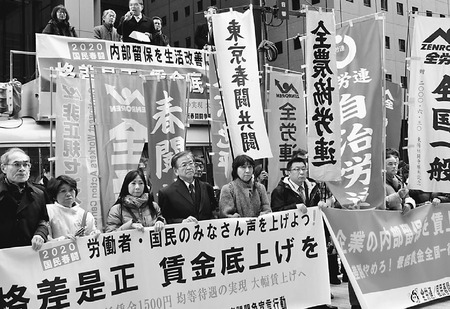 全労連、国民春闘共闘、東京春闘共闘は16日、全国一律最低賃金1500円、大幅賃上げなどを掲げ国民春闘の「闘争宣言行動」に取り組みました。