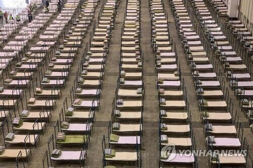4日、中国湖北省武漢の大型展示場に新型コロナウイルス感染症の患者を収容するための病床が設置されている。