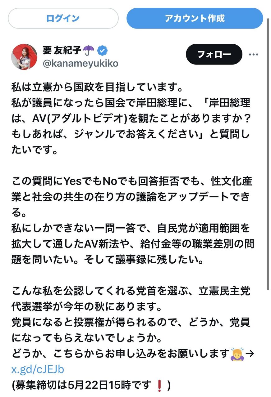 私が議員になったら国会で岸田総理に、「岸田総理は、AV(アダルトビデオ)を観たことがありますか?もしあれば、ジャンルでお答えください」と質問したいです。