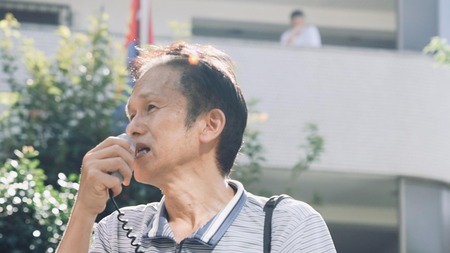 駐日モンゴル国大使館前で抗議する杉原浩司さん(構二葵撮影)