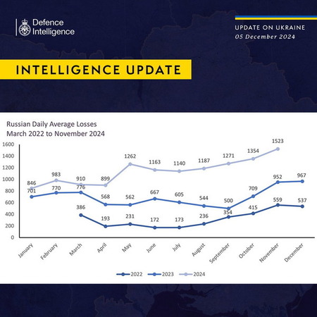 同国防省によると、ウクライナ軍参謀本部が報告した11月におけるロシア軍の1日平均死傷者数は1523人で、3か月連続で最高記録を更新したとのこと。