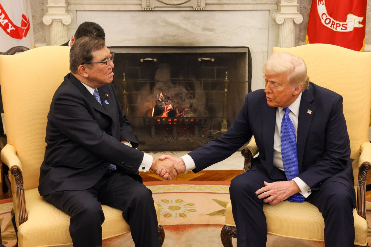 また握手を求めたトランプ氏に対し、石破首相は当初いすのひじ掛けに左ひじを置いたまま応じた。その後、トランプ氏と握り合った右手に、左手を添える場面があった。