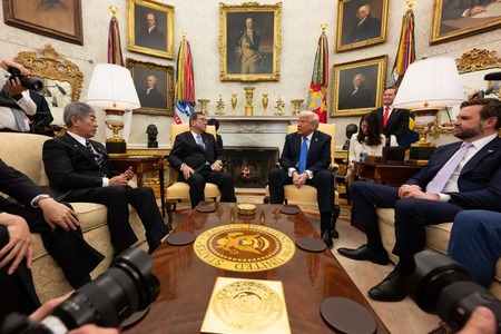 ホワイトハウスの大統領執務室内で行われた会談冒頭は報道陣に公開され、NHKも生中継で2人のやりとりを報じた。その際、ゴールドカラーのいすに座った石破首相は、座り方が少しだらしない様子に見受けられた。