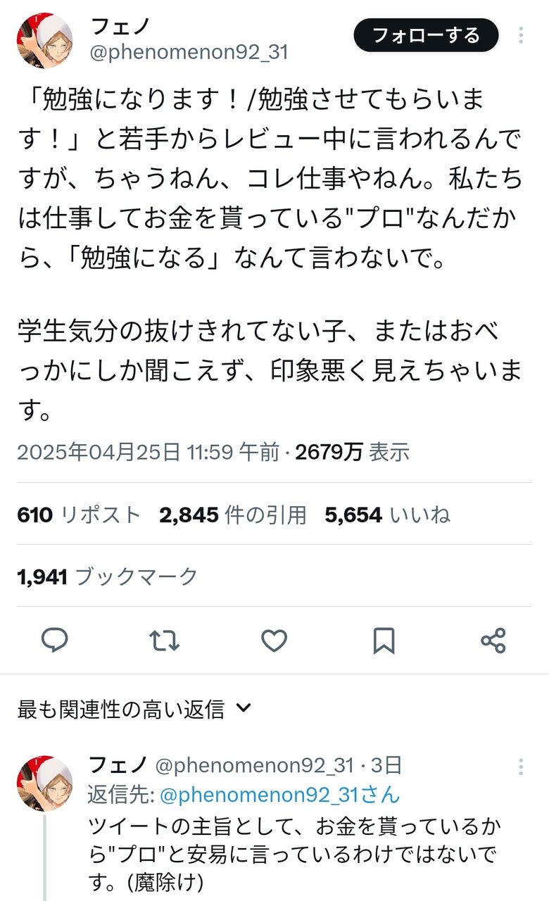 >ツイートの主旨として、お金を貰っているから"プロ"と安易に言っているわけではないです。(魔除け)