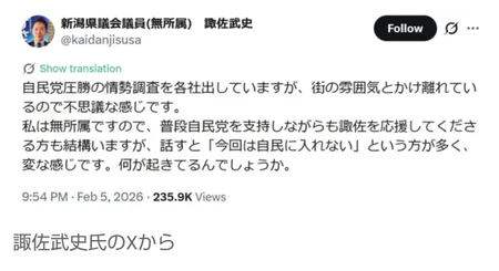 ¡¡³Æ¥á¥Ç¥£¥¢¤Î½°±¡ÁªÄ´ºº¤Ç¤Ï¸½Ãʳ¬¤Ç¡¢Â¿¤¯¤Ï¼«Ì±ÅÞ¤¬¾¡Íø¤¹¤ë²ÄǽÀ¤òÊ󤸤Ƥ¤¤ë¡£¤½¤¦¤·¤¿Ãæ¡¢¿Ûˬ»á¤Ï¡Ö¼«Ì±ÅÞ°µ¾¡¤Î¾ðÀªÄ´ºº¤ò³Æ¼Ò½Ð¤·¤Æ¤¤¤Þ¤¹¤¬¡¢³¹¤ÎÊ·°Ïµ¤¤È¤«¤±Î¥¤ì¤Æ¤¤¤ë¤Î¤ÇÉԻ׵Ĥʴ¶¤¸¤Ç¤¹¡×¤È½ñ¤½Ð¤·¤¿¡£