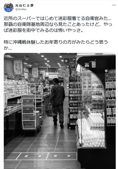 近所のスーパーではじめて迷彩服着てる自衛官みた…