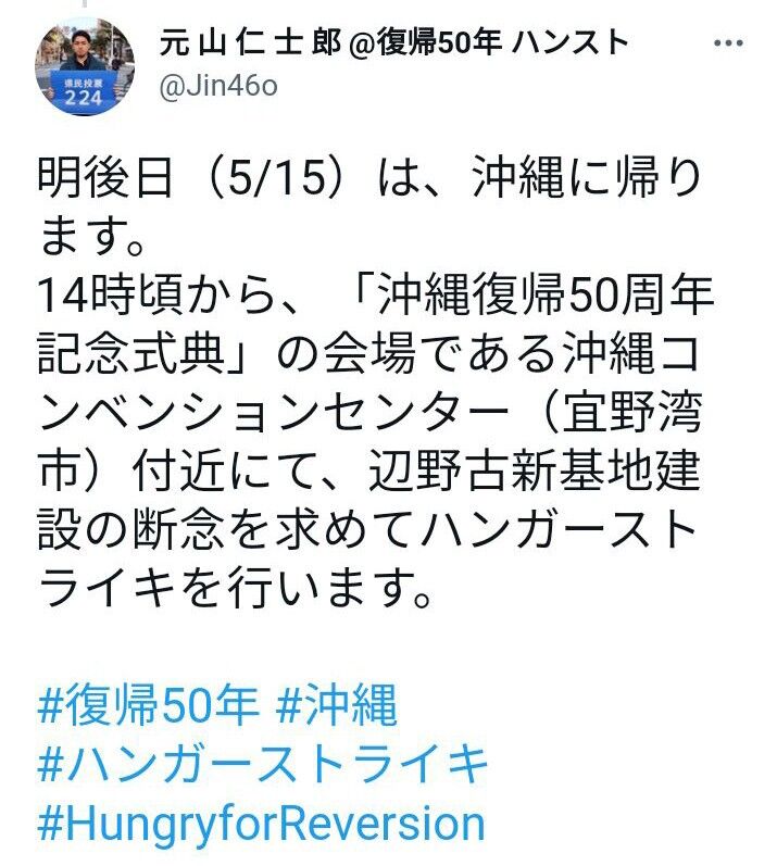 14時頃から、「沖縄復帰50周年記念式典」の会場である沖縄コンベンションセンター(宜野湾市)付近にて、辺野古新基地建設の断念を求めてハンガーストライキを行います。