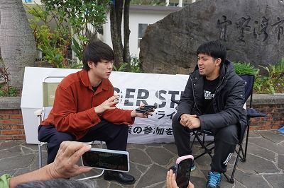 ハンガー・ストライキ実施の記事を見て沖縄に足を運んだという村本さんは、名護市辺野古の新基地建設や県民投票などについて、元山さんにインタビューし、ラジオで配信した。