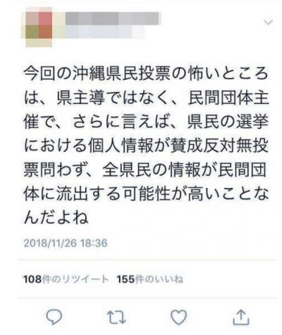 ツイッターでは、ある個人アカウントが11月26日付で「今回の沖縄県民投票の怖いところは、県主導ではなく、民間団体主催で、さらに言えば、県民の選挙における個人情報が賛成反対無投票問わず、全県民の情報が民間団体に流出する可能性が高いことなんだよね」とつぶやいた。