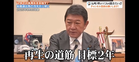 茂木氏に対し、読売新聞特別編集委員の橋本五郎氏が、党幹事長や外相など政府の要職を歴任しながら、これまで首相の座に近づく機会がなかった理由を質問。茂木氏は「発信力が足りなかった」などと応じた。 茂木氏は5人の中で最初に出馬を表明しており、告示までの間に多くの現場視察を重ねているが、21日に都内の子ども食堂を視察した際の映像が報じられた後、視察の際に誕生日祝いのケーキを供されたことについて、一部メディアやSNSなどで賛否が起き、思わぬ騒動になっている。