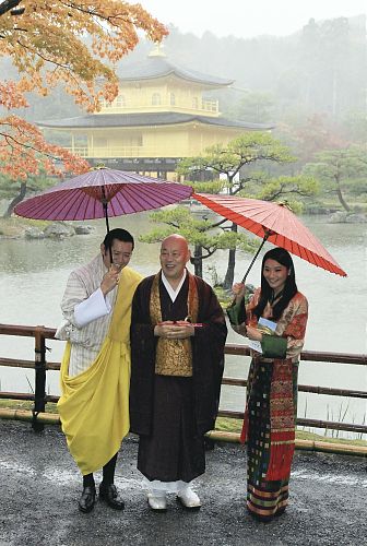画像 有馬住職(中央)の案内で金閣寺を散策するブータンのワンチュク国王(左)とジェツン・ペマ王妃(19日午前)=川崎公太撮影