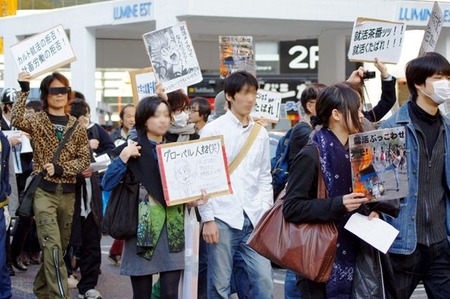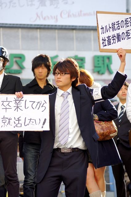 デモは、祝日でにぎわう新宿で道行く人々の注目を集めたが、なかには「就職できなかった連中が