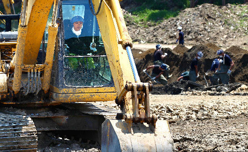 ※画像:大川小の6年生だった平塚小晴さんを捜し出そうと重機を使って同小の南側を掘り起こす母親のなおみさん(37)。