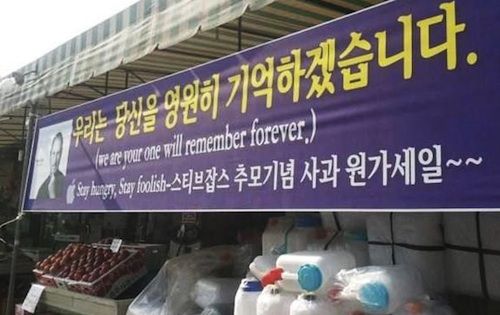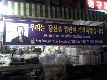 - 韓国のとあるスーパーマーケットが、アップルの創業者で10月5日に死去が報じられたスティーブ・ジョブズを追悼する横断幕を掲げながら、