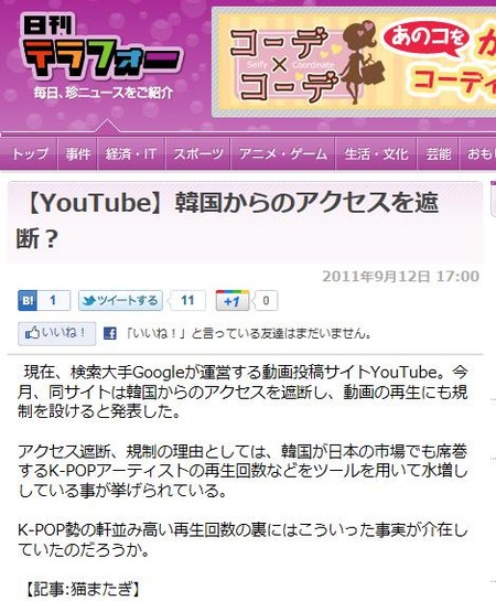 この記事が削除されると同時刻に『日刊テラフォー』が同じ記事を公開している。その見出しが「【YouTube】韓国からのアクセスを遮断?」と
